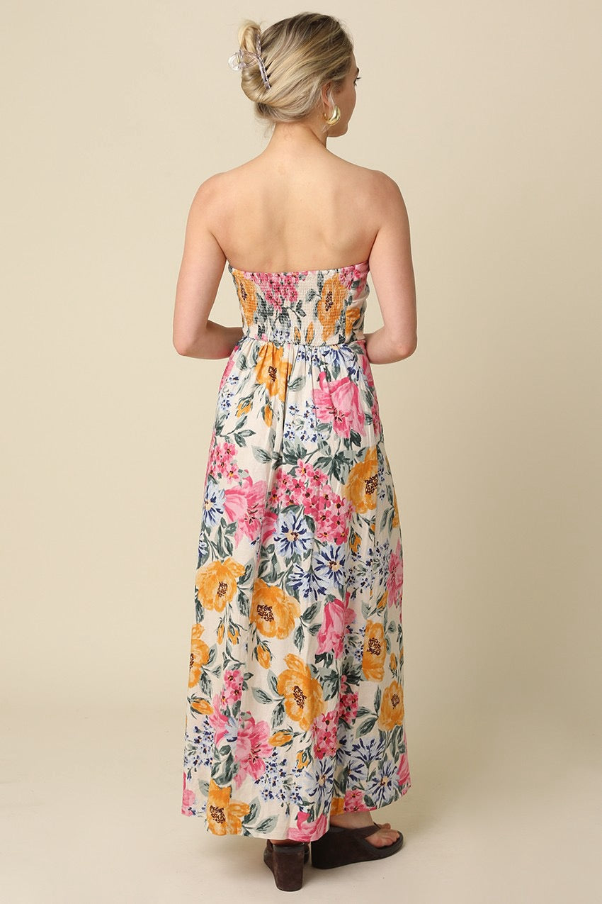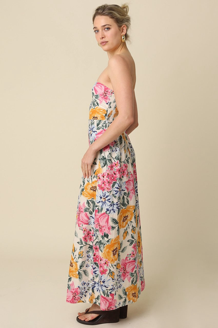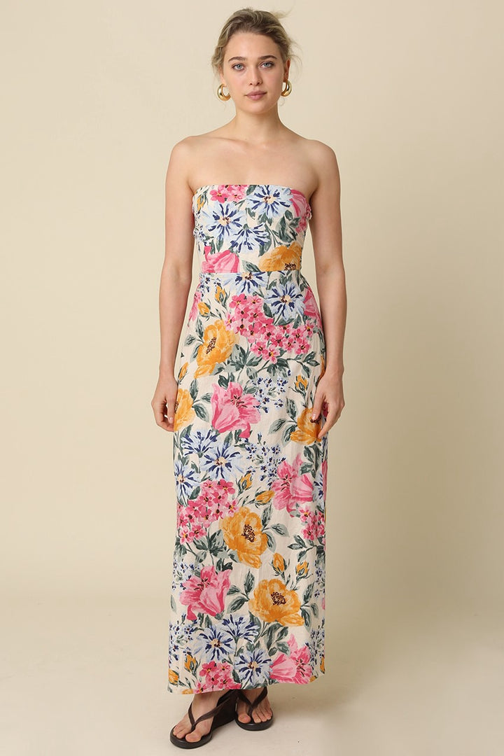 Our Mina Strapless Floral Maxi Dress features a strapless straight neckline for a clean, elegant silhouette and a softly fitted bodice with a flowy full length skirt and back zipper closure that creates effortless movement. The allover floral print and lightweight linen blend fabric add a romantic, feminine touch perfect for warm weather occasions.
