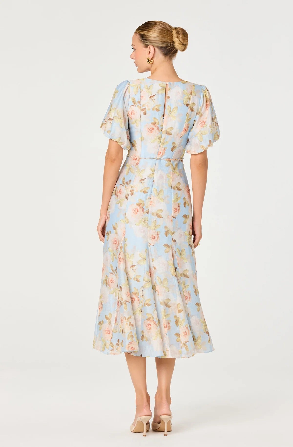 Romantic balloon sleeves and a soft floral print give this midi dress vintage-inspired charm. The V-neckline and self-tie belt define the waist while the godet skirt moves beautifully.