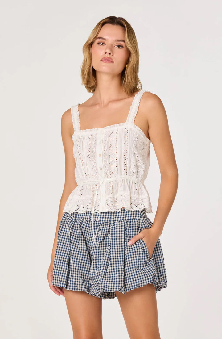 An elevated take on boho style. This cropped tank features all the key romantic details: embroidered eyelet, crochet lace, ruffle trim, pintuck detailing, and a ribbon at the waist.