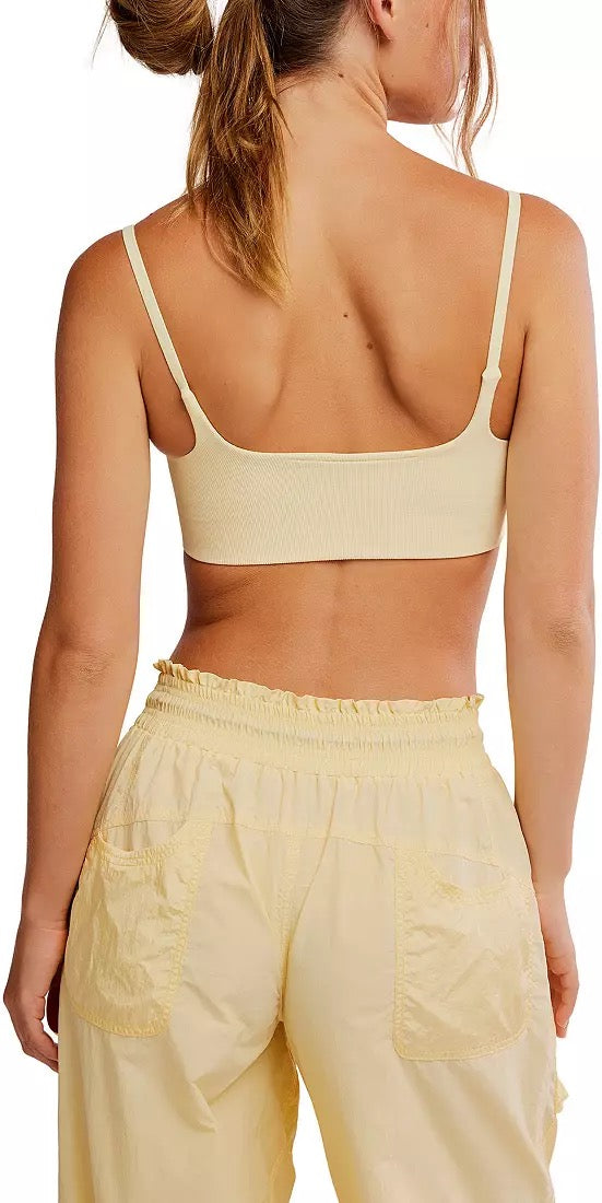 Ribbed fabrication with four-way stretch; compressive feel; square neckline; seamless design; low open back; fixed shoulder straps; moisture-wicking; low-impact design