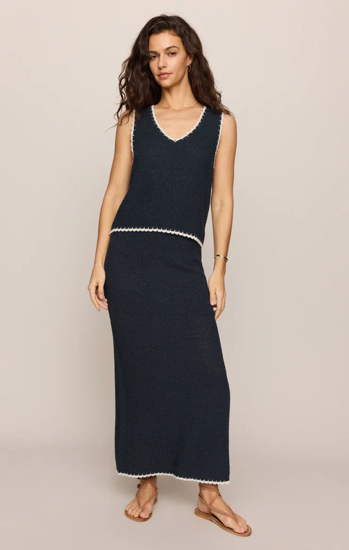 This midi length skirt stands out with contrast color trim, yarn blend fabric, and a flattering relaxed silhouette. Make it a set with the Yessenia Whipstitch Tank.